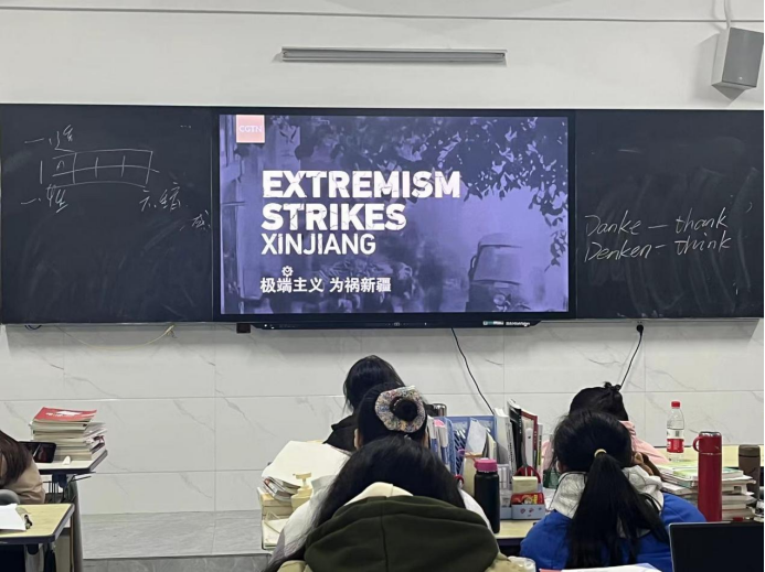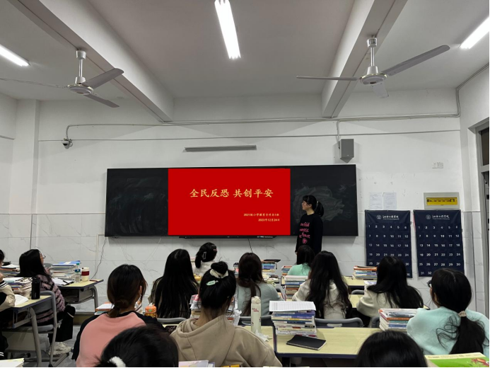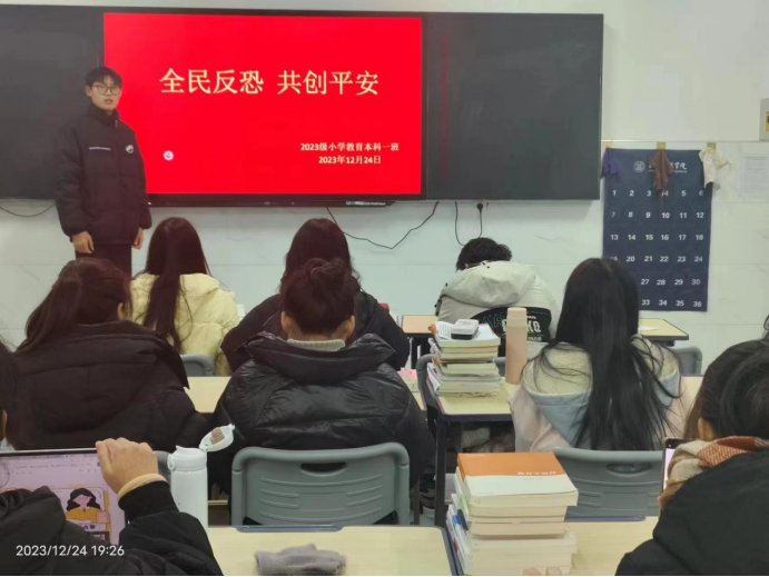 各班级负责人首先给班上同学观看了反恐防暴主题视频,之后围绕班会主题,给同学们讲解了公民安全防范常识、如何对暴力恐怖犯罪线索进行举报等反恐常识,以及一些应对暴力恐怖袭击的原则和策略。通过恐怖袭击案例来为同学们讲解了恐怖暴力的手段表现、反恐防暴相关法律法规、反恐防暴应对措施以及受伤后的自救方法等内容。针对同学们的实际情况,共同总结与分析应对紧急事件的方法。