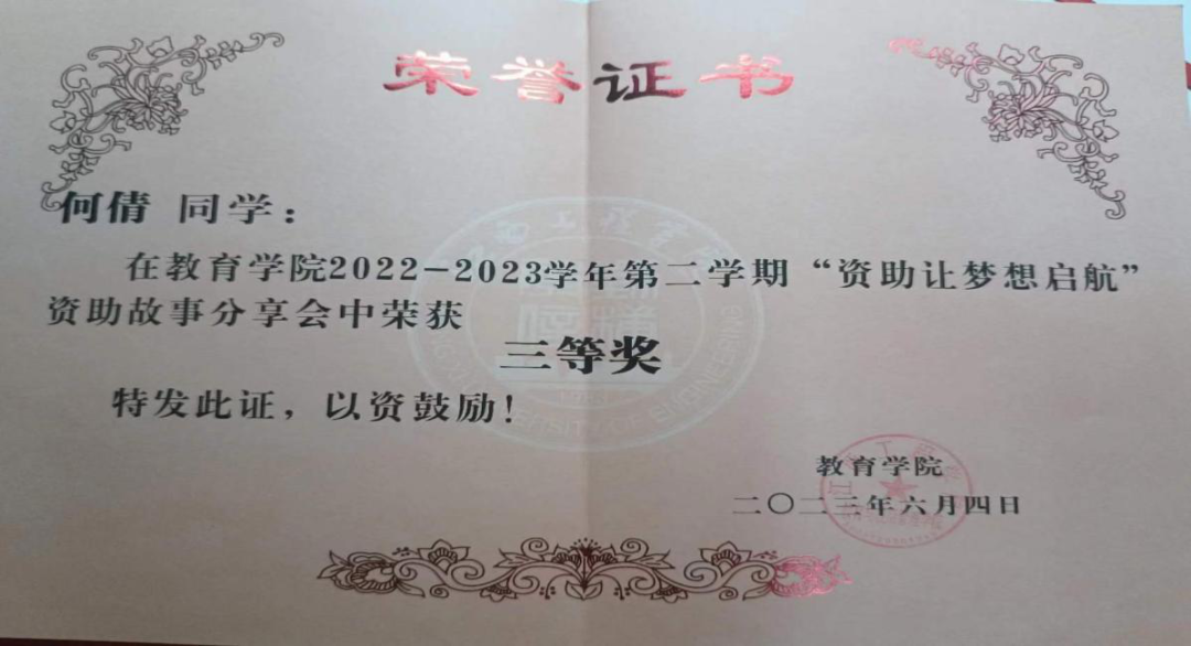2.2022-2023学年在“资助让梦想启航”资助故事分享会中,荣获三等奖