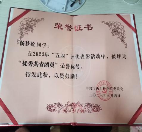 1.2023年5月,荣获2023年五四评优表彰活动“优秀共青团员”荣誉称号;
