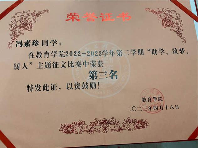 4.在2022-2023学年“助学、筑梦、铸人”主题征文活动中获得第三名;