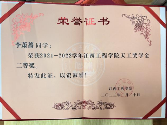 3.2022-2023学年第二学期,荣获“天工二等奖学金”;