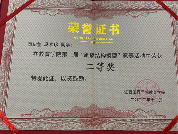 1. 2022年在“纸质结构模型”竞赛活动中获得二等奖;