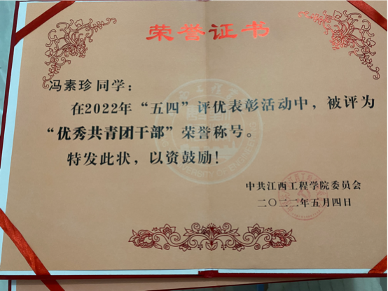 5.2022年荣获“优秀共青团干部”荣誉称号;