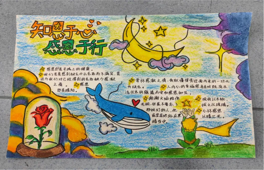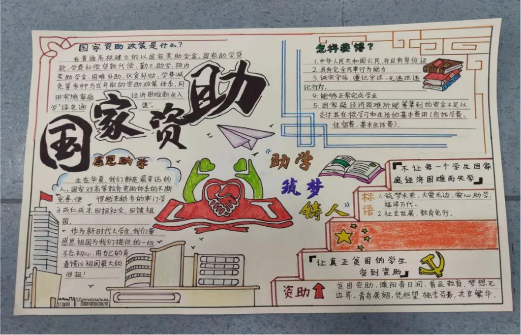 活动期间同学们积极参与,热情高昂。在本次手抄报作品中,精美的图案、简洁的文字、新颖的版面无不表达了同学们对国家资助政策的理解以及对党、国家、社会、学校的感恩之情。他们通过一笔一画、一图一纸,畅谈了“未来靠自己描绘”的成长感悟,践行着“用热情拥抱生活,把青春献给时代”的理想信念,立志当好“新时代有为青年”,始终心怀感恩,逐梦未来。
