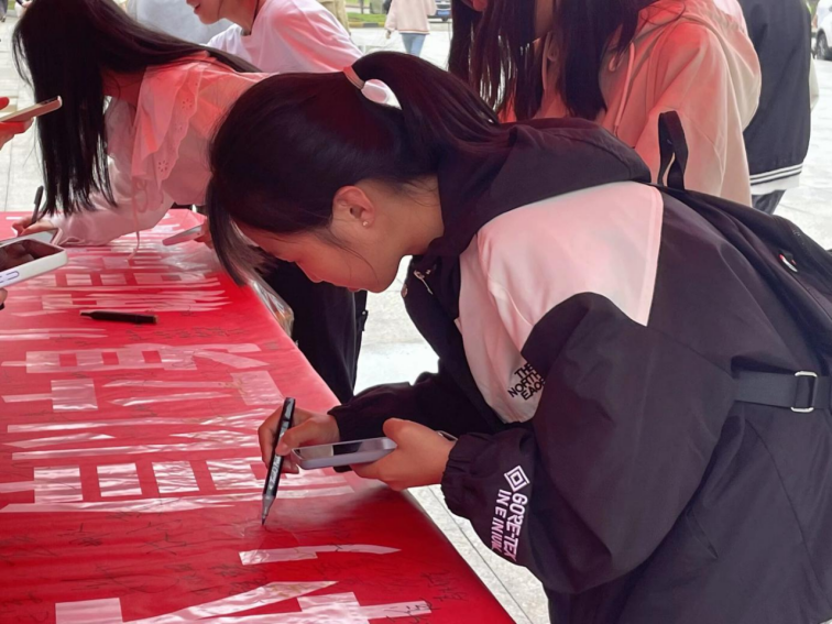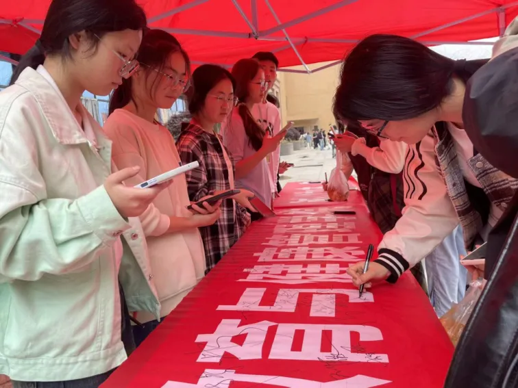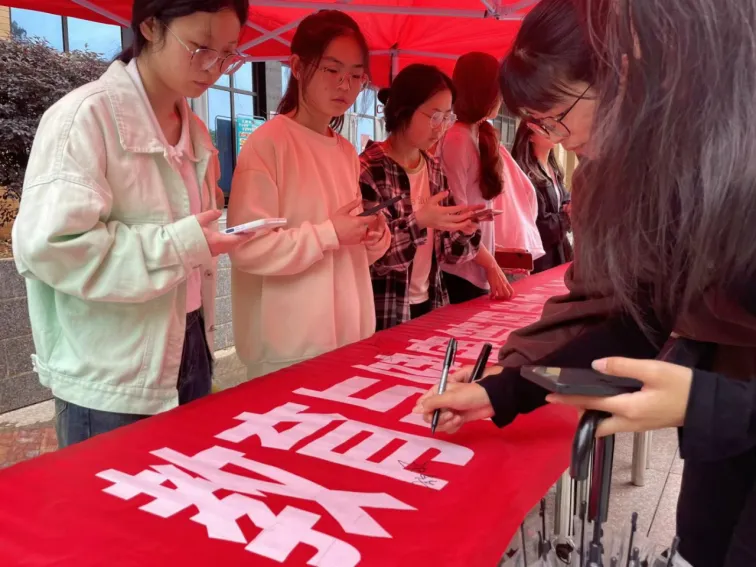在签名环节,同学们热情高涨,依次来到签名区。他们在认真聆听讲解的过程中,对诚信资助有了更深刻的认识,在签名时更加坚定了自己的决心。当走到横幅前,每个人都郑重地拿起签字笔,略微停顿片刻,似乎在心中再次重温自己的承诺。有的同学下笔如飞,签名时一气呵成,展现出坚定的决心;有的同学则写得较慢,每一笔都写得极为认真,仿佛在用心书写着对诚信的尊重。