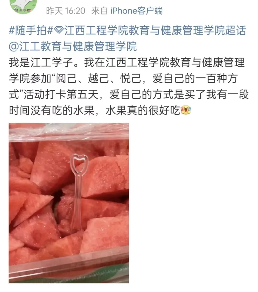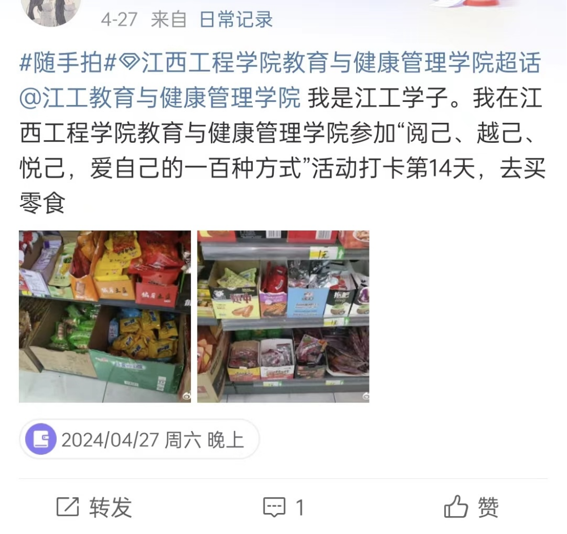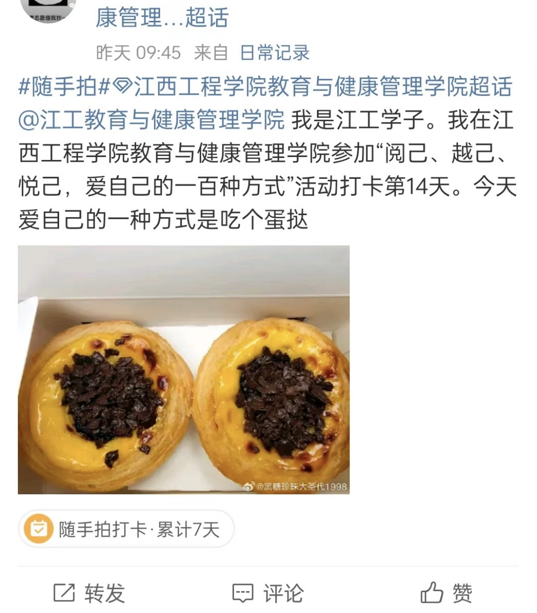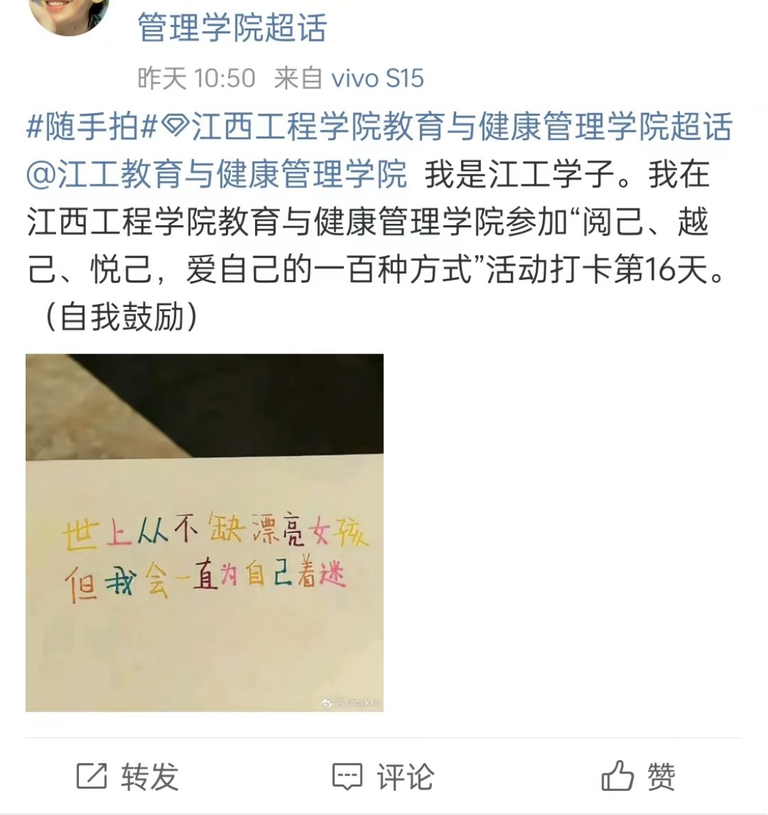 在这次活动中,公司学子展现了极大的热情与参与度。每位参与者需要通过发表微博打卡来分享他们如何以实际行动爱自己,参与者需每天更新自己的打卡内容并坚持打卡,不得中途退出,以此展现他们对爱自己承诺的坚持。活动期间,同学们坚持每天将记录着爱自己的记录板发送给工作人员,展现出多样的自我关爱方式。