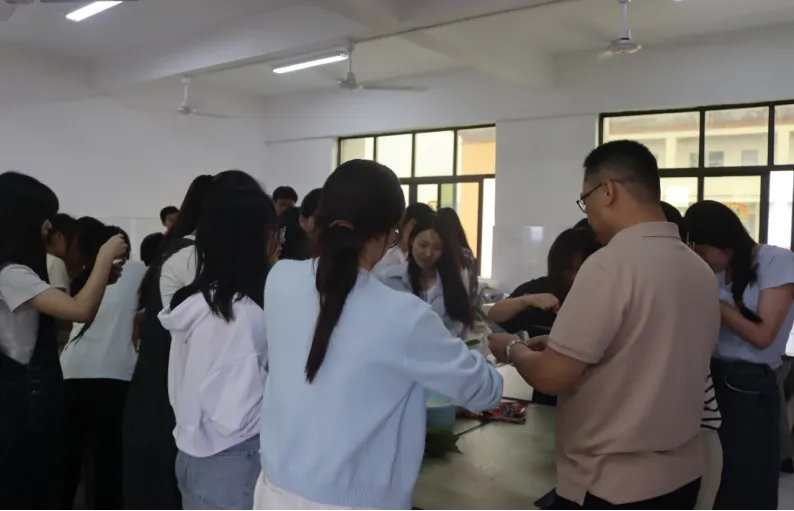 活动现场,刘永东书记与同学们欢聚一堂,和大家围在一起包粽子。现场热情高涨,大家都专注投入。折叠粽叶,舀放、盖严食材,再用线绳系紧……每一个步骤都做得那么认真,每一道工序都那么细心投入。一片片粽叶、一根根线绳在大家手中灵活地跳动着。师生们尽情享受着包粽子带来的乐趣,整个活动过程充满了欢声笑语。
