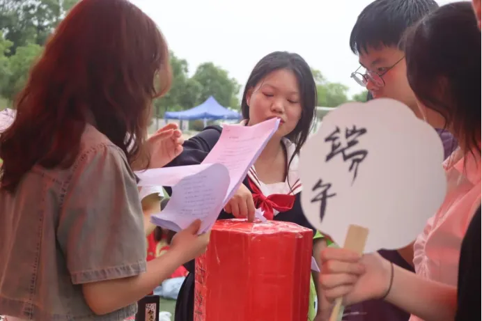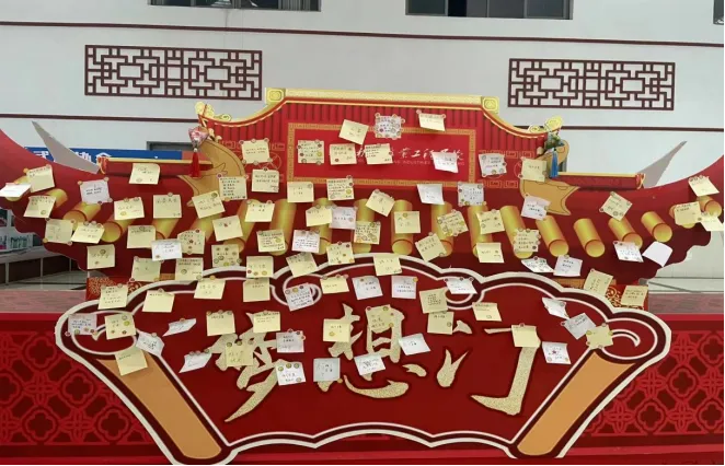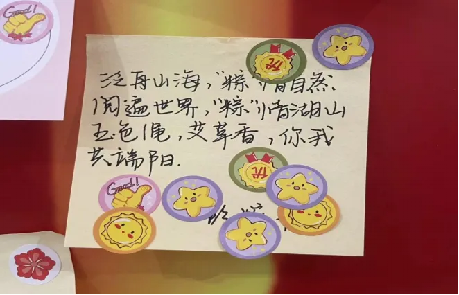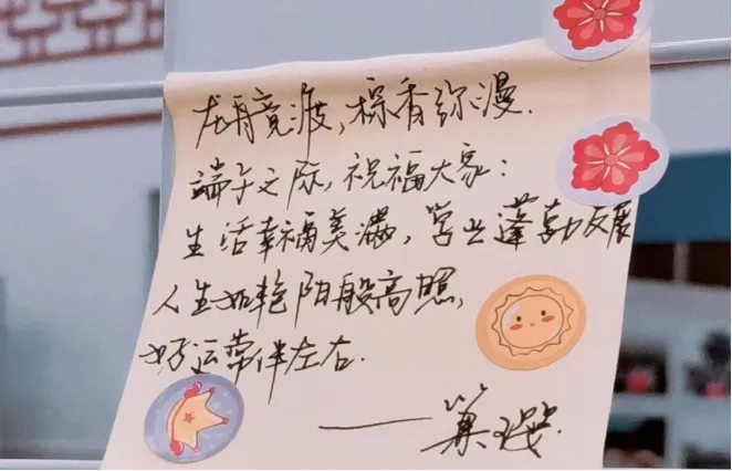 同学们领取便笺纸,写下自己对端午的寄语、祝福或感想。接着,将写好的便笺纸贴在指定区域展示。同学们将祝福寄于多情的笔,在带有浓郁中国风的纸上写下最能表达自己心意的端午寄语。