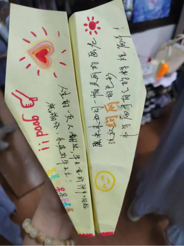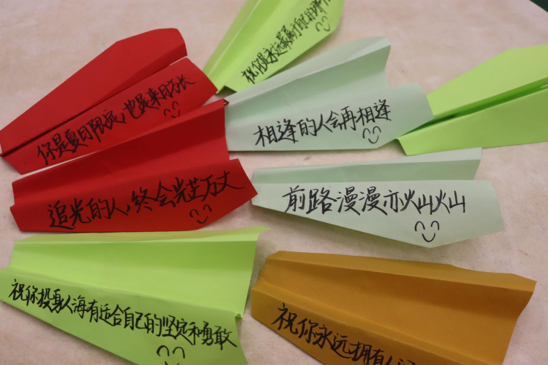 在毕业之际,为了让大家留下难忘的回忆,我们为学长学姐们制作了带着心愿和祝福的纸飞机。每一道折痕,都是青春的印记,每一架纸飞机,都承载着对学长学姐的祝愿。愿大家都能乘风破浪,像那纸飞机一样,在广阔的天空中,找到属于自己的方向。