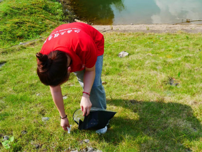捡拾每一片垃圾,尤其对一些隐藏在草丛中的垃圾,进行了细致的清理。