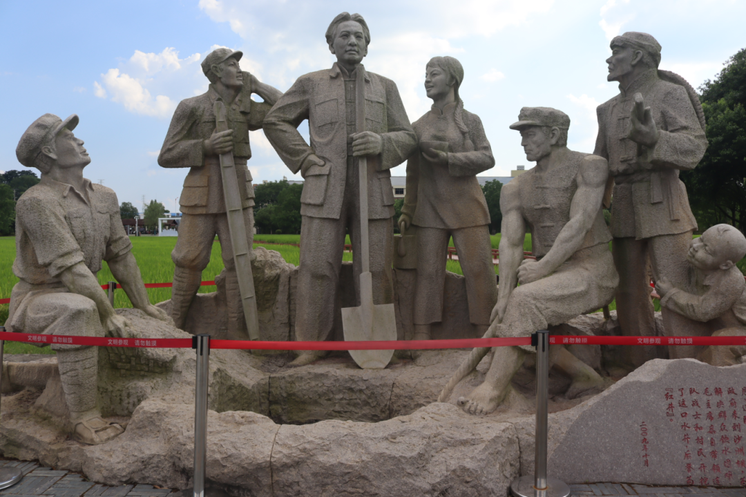 二苏大景区位于城西北1.5公里的沙洲坝境内,中华苏维埃临时中央政府大礼堂便在此处,这是红军留在瑞金的唯一建筑物。其造型独特,从空中俯瞰,宛如大地中的红军八角帽,这是北京人民大会堂的前身,也是苏区时代的标志性建筑。队员们重温了毛泽东、周恩来等老一辈革命家在革命年代的那段烽火岁月,对苏区精神有了更加深刻的感悟。