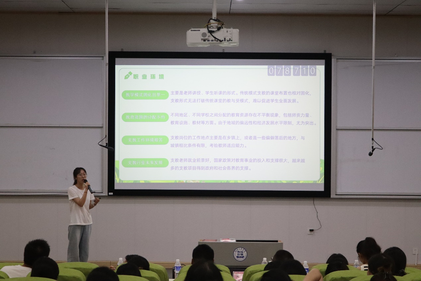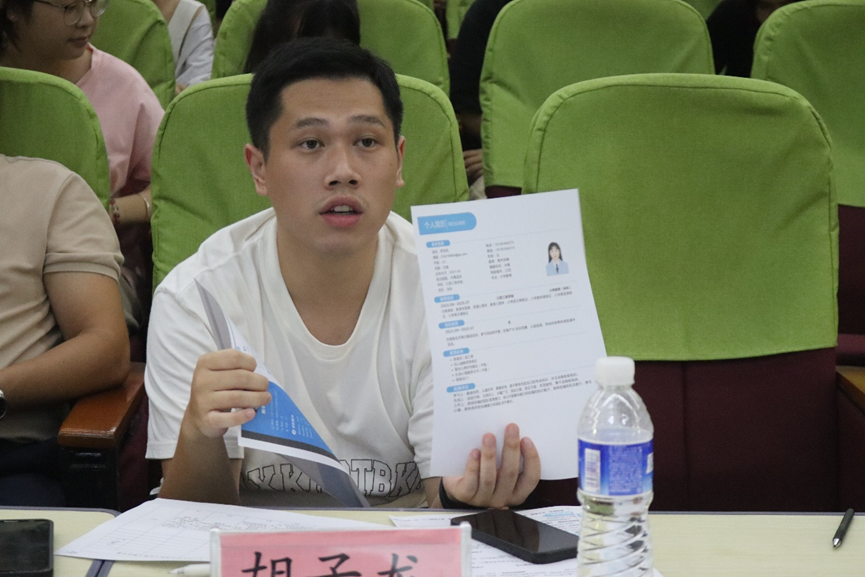 比赛过程中,7位参赛选手陈述个人求职意向和职业准备情况,根据自身求职岗位类别选择展示自身通用素质、岗位能力、专业技能等。通过比赛选手们展现出才华与坚定的梦想。她们通过精心制作的PPT、生动形象的视频展示向评委和观众阐述了自己对职业目标的理解。有的选手聚焦于支援西部教育事业,立志成为优秀支教教师,用专业知识为西部计划献一份力;有的则关注道法教育,希望成为道法教育的推动者,为培养更多优秀人才贡献力量。