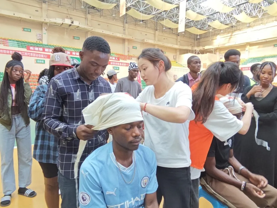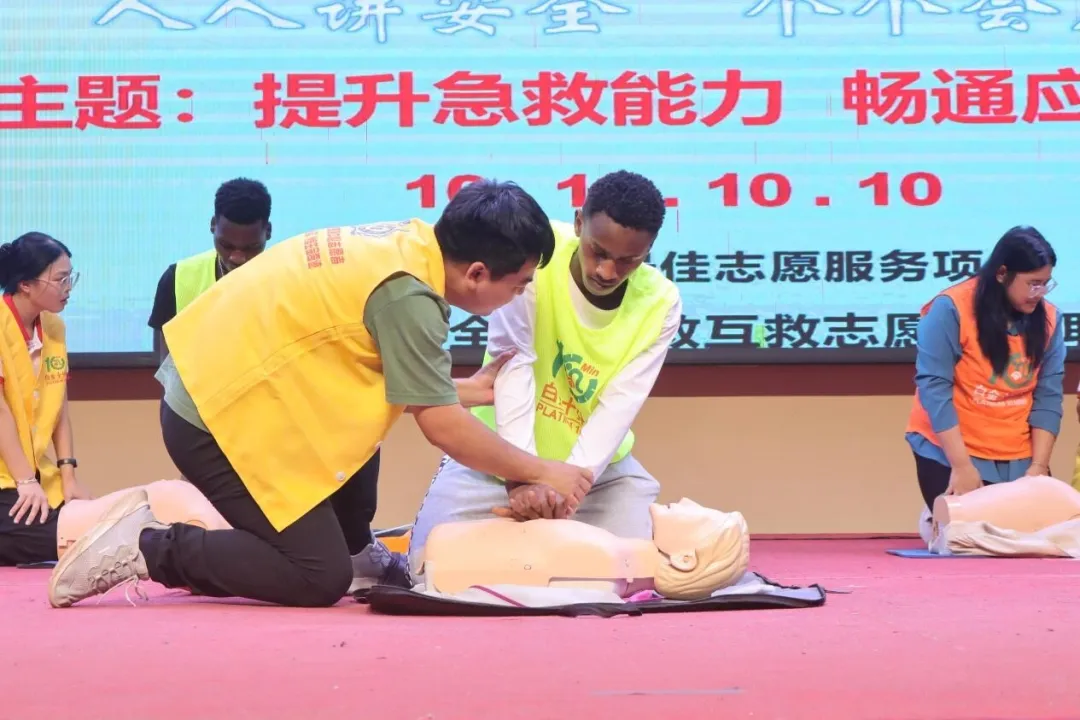 通过理论与实践相结合的宣传科普方式,激发了全体师生浓厚的学习兴趣。活动现场气氛融洽而活跃,来自博茨瓦纳、巴基斯坦、尼日利亚、埃塞俄比亚等国的职工们纷纷上台进行实践操作亲自体验,主动学习单人心肺复苏、双人心肺复苏、AED的使用、异物窒息海姆立克急救法、止血包扎等技术。医务人员耐心示范讲解,不断纠正员工们的错误动作和姿势,规范每一步的细节动作,以便职工们更好地掌握“自保、自救、互救”的技能。