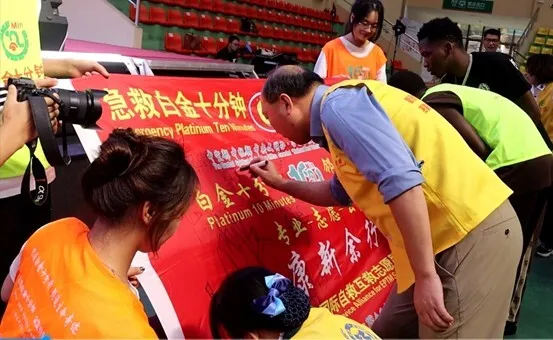 (志愿者们在“急救白金十分钟——全国(国际)自救互救活动日”红旗上签名)
