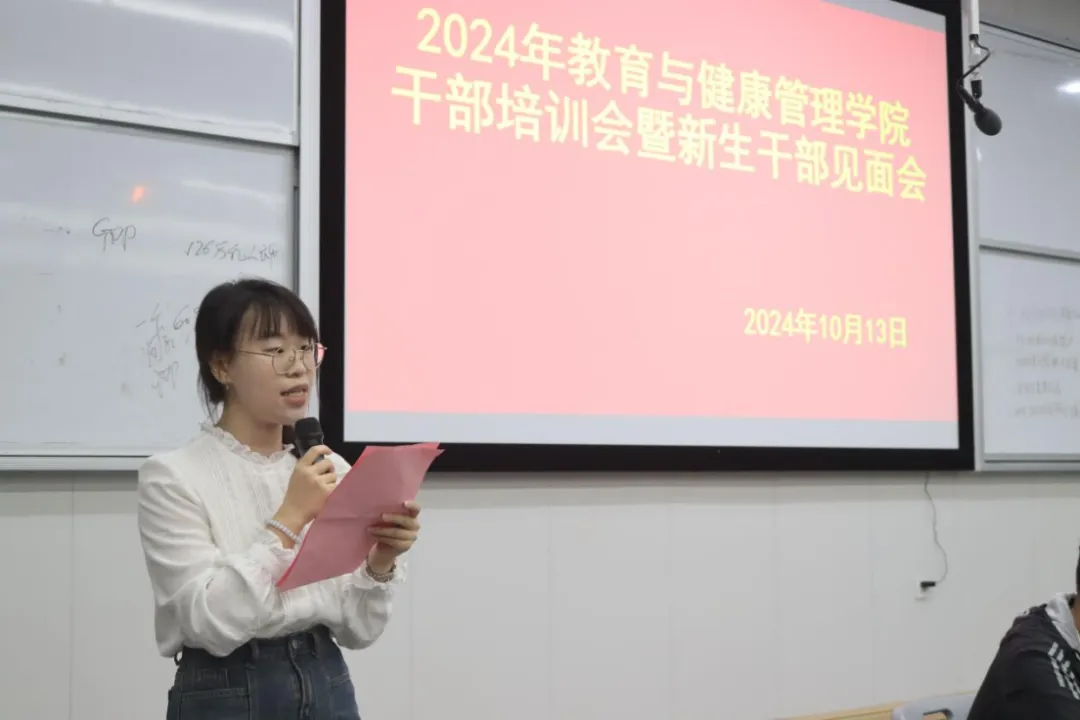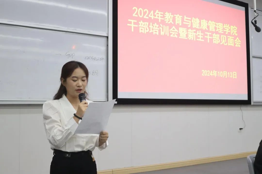 随后,团总支员工会老生代表吕薇同学上台发言。她以自己的亲身经历,分享了在员工工作中遇到的挑战与收获,鼓励新生干部勇于担当,不断创新,为学院的发展贡献自己的力量。