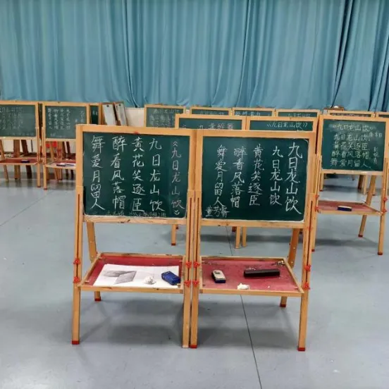 在比赛现场,同学们展现出了扎实的书写基本功和独特的艺术风格。无论是楷书的端庄秀丽,行书的流畅灵动,还是隶书的古朴典雅,都在黑板上熠熠生辉。每一笔每一画都倾注了同学们的心血,展现了他们对书法艺术的执着追求。