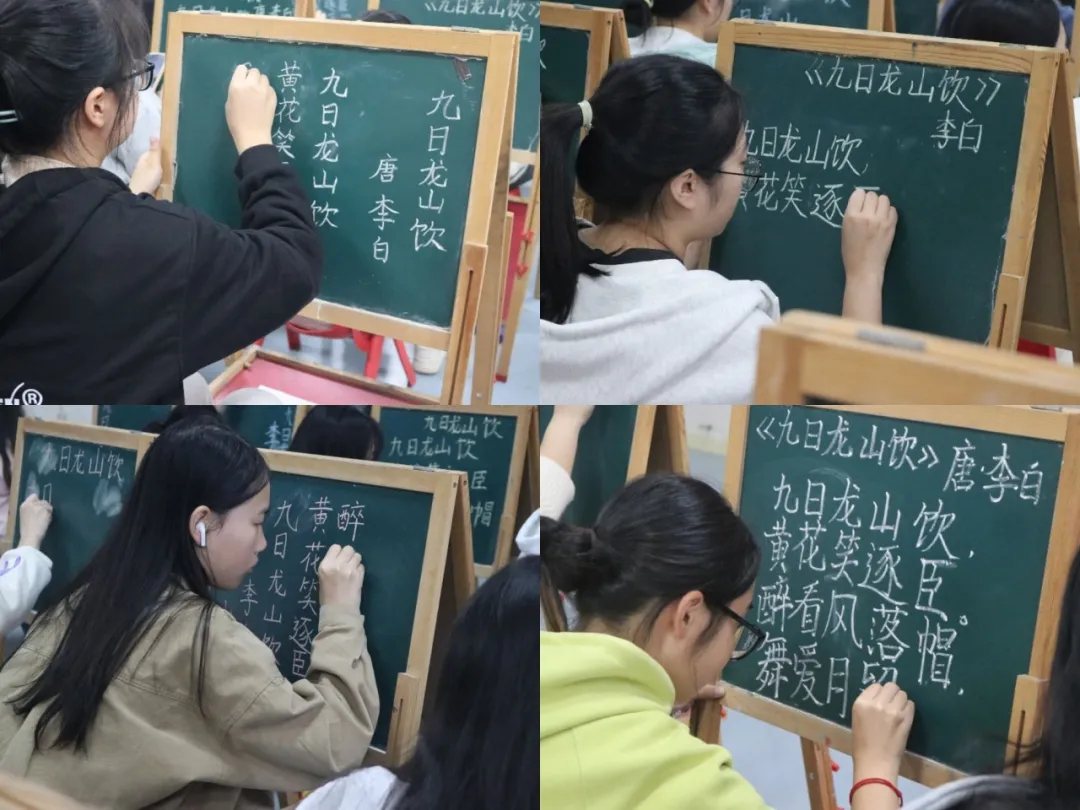 重阳节,这个承载着丰富文化内涵的传统节日,自古以来就激发了无数诗人的灵感,留下了诸多经典诗句。本次大赛以重阳为主题,让同学们在书写相关诗句的过程中,深入领略重阳文化的内涵与习俗,增强文化认同感。粉笔字作为教师的基本功之一,此次大赛为ylzzcom永利总站全体员工搭建了一个展示书写技能的绝佳平台。在这里,同学们可以尽情展现自己的书法功底,无论是楷书的规整、行书的流畅还是隶书的古朴,都在黑板上绽放光彩。