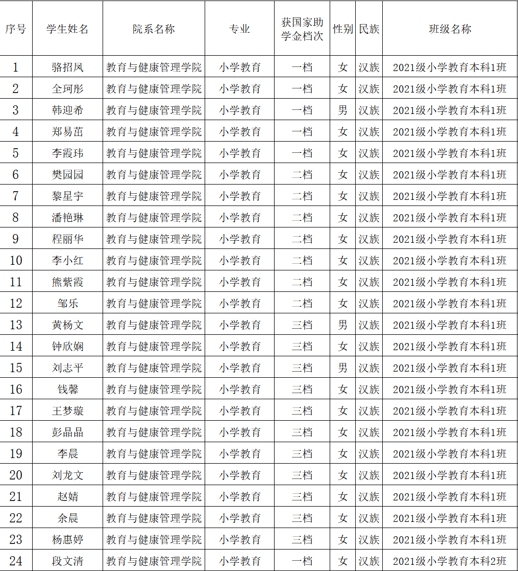 为进一步做好公司2024—2025学年国家助学金评定工作,确保员工资助工作的精准度和规范化,根据《江西省财政厅关于下达2024年员工资助补助经费省级预算的通知》(赣财教指[2024]28号)、《关于做好2024年高校本专科生国家奖助学金评审及资金发放工作的通知》(赣助中心〔2024〕15号)和《关于做好公司2024-2025学年家庭经济困难员工认定和建档工作的通知》(校政学字[2024]33号)文件精神,结合学院实际,坚持公开、公平、公正的原则,经个人申请、班级评议、审核及分院国家奖助学金评审工作小组初审通过,现将国家助学金拟受助员工名单公示如下: