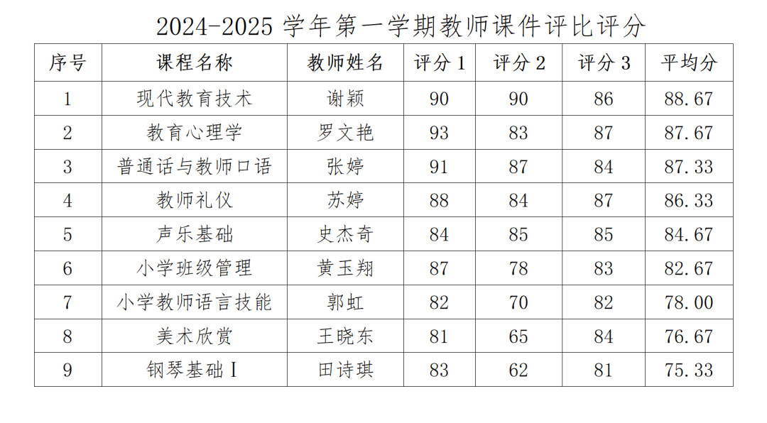 2024年11月5日上午,公司进行了2024—2025学年第一学期教师课件评比活动。史小力教授、李海萍教授、仇晨霞副教授担任评委,对公司9位教师9门课程的教学课件进行评价打分,为保证结果的公正性,评分过程中所有课件均隐去参赛教师个人信息。最终,谢颖《现代教育技术》课件获得第一名,罗文艳《教育心理学》课件获得第二名,张婷《普通话与教师口语》课件获得第三名。具体评分情况如下表。