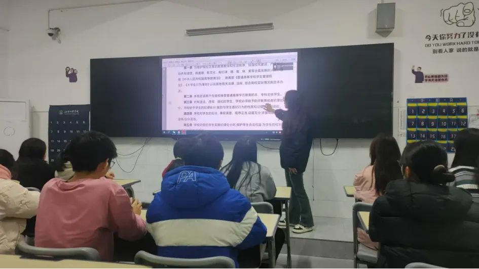 班会伊始,各班班长详细解读了其中涵盖的学籍管理、日常行为规范、奖惩制度等重要内容。在讲解过程中,特别强调了遵守考勤制度的重要性,明确指出旷课将对学业产生严重影响,同时也对校园文明礼仪规范进行了深入阐释,倡导同学们从点滴小事做起,展现新时代青年的良好风貌。生动的案例剖析,让同学们深刻认识到每一条规定背后的深远意义。