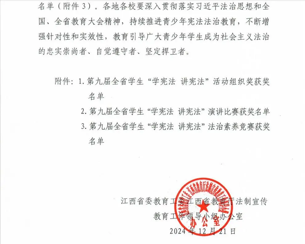 2024年12月21日,在第九届全国员工“学宪法讲宪法”活动中,公司2023级小学教育本科2班沈艳同学荣获法治素养竞赛三等奖,展示了公司青年尊法学法守法用法的精神面貌。