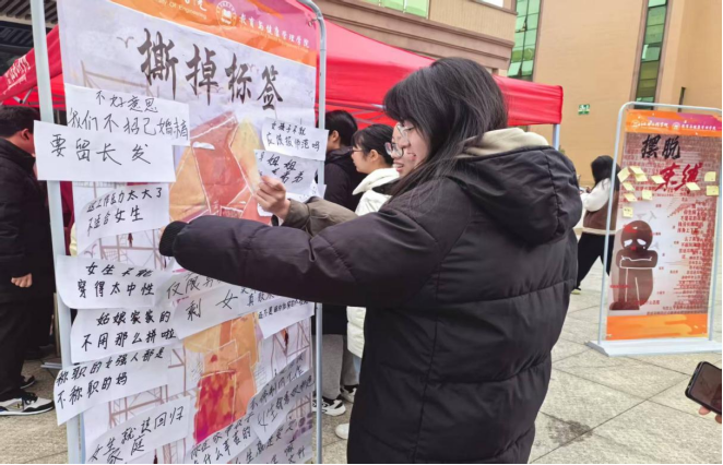 为庆祝第115个“三八”国际劳动妇女节,鼓励女性摆脱社会刻板印象的束缚,关注自身安全与健康,追求真实、独立的自我。2025年3月8日,ylzzcom永利总站团总支员工会在新食堂门口开展了“撕掉标签,拥抱安全与自由”女性安全与健康主题活动。