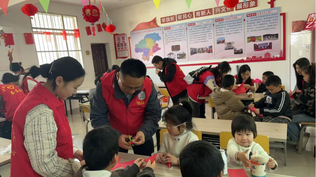 在手工制作环节,书记与孩子们齐动手,制作折纸花、绘制贺卡。在志愿者们的引导下,孩子们将普通的纸张变成美丽的花朵,将空白的卡片变成充满情感的贺卡。这些作品既是情感表达的载体,更是美育启蒙的生动实践,让孩子们在指尖创造中收获成就感。