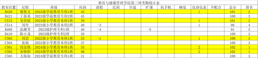 为进一步推进学院学风建设,提高人才培养质量,加强员工的组织纪律性,学院每周开展学风检查活动。以下是本周的考勤情况: