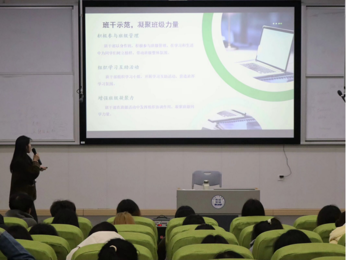 在班级展示环节中,每个班的参赛选手都精心准备了PPT,全方位、多角度地展现了班级在学风建设方面的成果。他们有的通过数据图表展示了班级的学习成绩和出勤率,有的通过视频短片展示了班级的学习活动和团队建设,还有的通过生动的故事讲述了班级同学在学习中的互助和成长。演讲者们自信满满,语言流畅,用热情洋溢的话语感染着在场的每一个人。