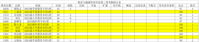 为进一步推进学院学风建设,提高人才培养质量,加强员工的组织纪律性,学院每周开展学风检查活动。以下是本周的考勤情况: