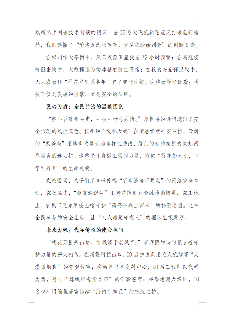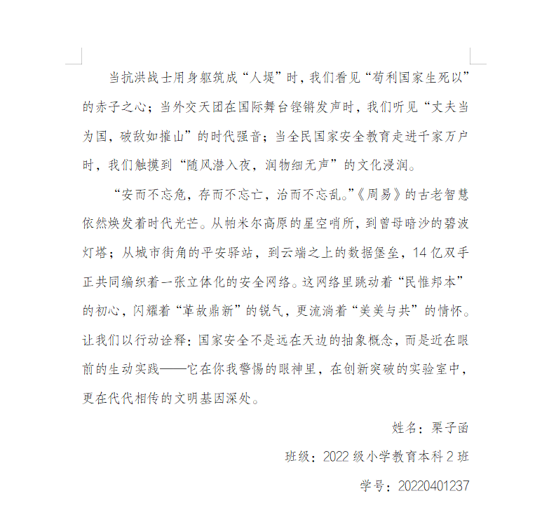 活动期间,来自各年级的参赛者围绕国家安全教育日主题,从政治安全、经济安全、网络安全等多维度展开创作。他们以议论文的思辨、记叙文的温情、散文的诗意,讲述身边故事,剖析时代命题,展现了新时代青年对国家安全的深刻认知与责任担当。