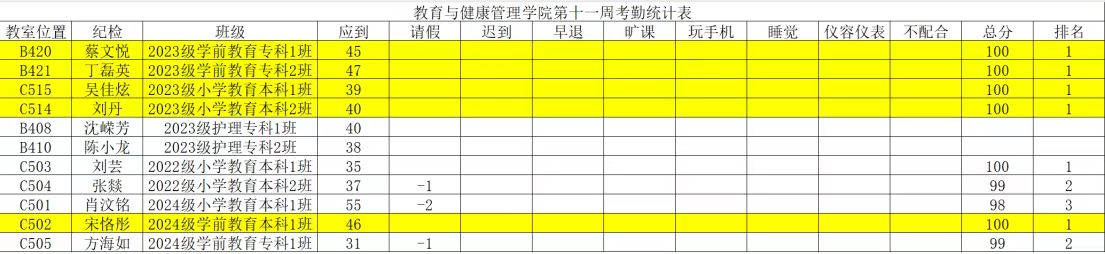 为进一步推进学院学风建设,提高人才培养质量,加强员工的组织纪律性,学院每周开展学风检查活动。以下是本周的考勤情况: